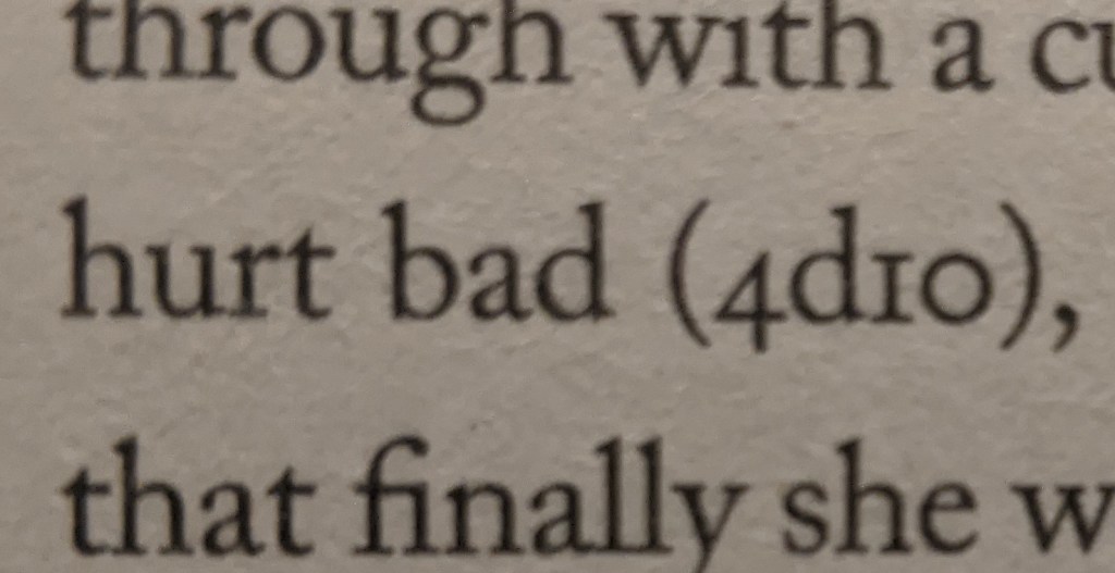 Now, it is not the fault of the author that the publishers picked a font that makes this hard to read. I am assuming it says ‘4d10’, as in ‘4 ten-sided dice’, like damage would be done in a game of dungeons of dragons. But what does that have to do with Oscar’s mother? This is her section of the book. Why are you mocking Oscar here? How does this work? Or perhaps it was peppered in here to give the book some kind of legitimacy of nerd cred? I have no idea. It just gave me a lot of confusion. It was just as confusing as when, just before another section in the story’s real narrative about Trujillo, we get this tone setter.